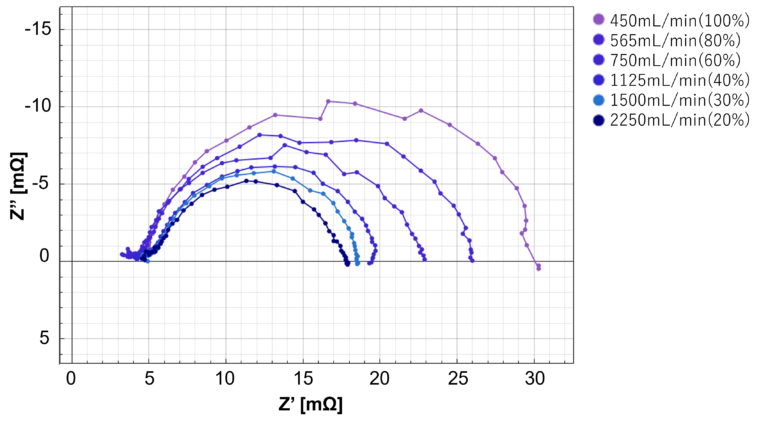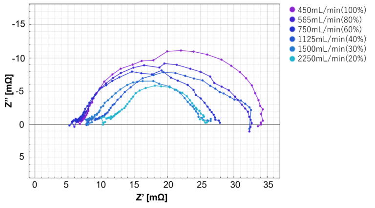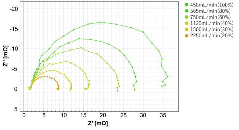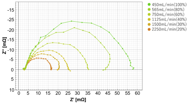 In EIS measurements, changes in internal conditions for each condition can be viewed from a Cole-Coile plot. By collecting and comparing EIS measurement data for each operating condition, it is possible to diagnose internal conditions based on resistance values, and thus to determine if components are deteriorating or membranes are drying out.