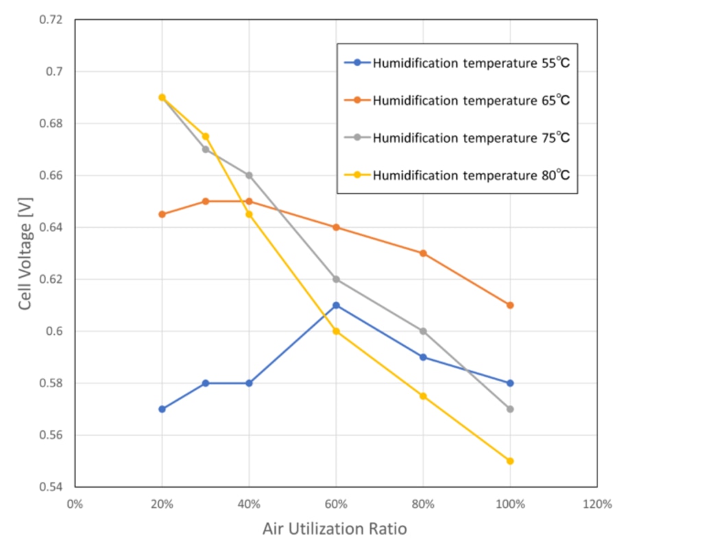As Figure 7 shows, when the humidification temperature is low, the cell voltage does not change much even if the air utilization rate is reduced, but when the humidification temperature is high, the cell voltage increases significantly when the air utilization rate is reduced. This may be due to the following two facts.