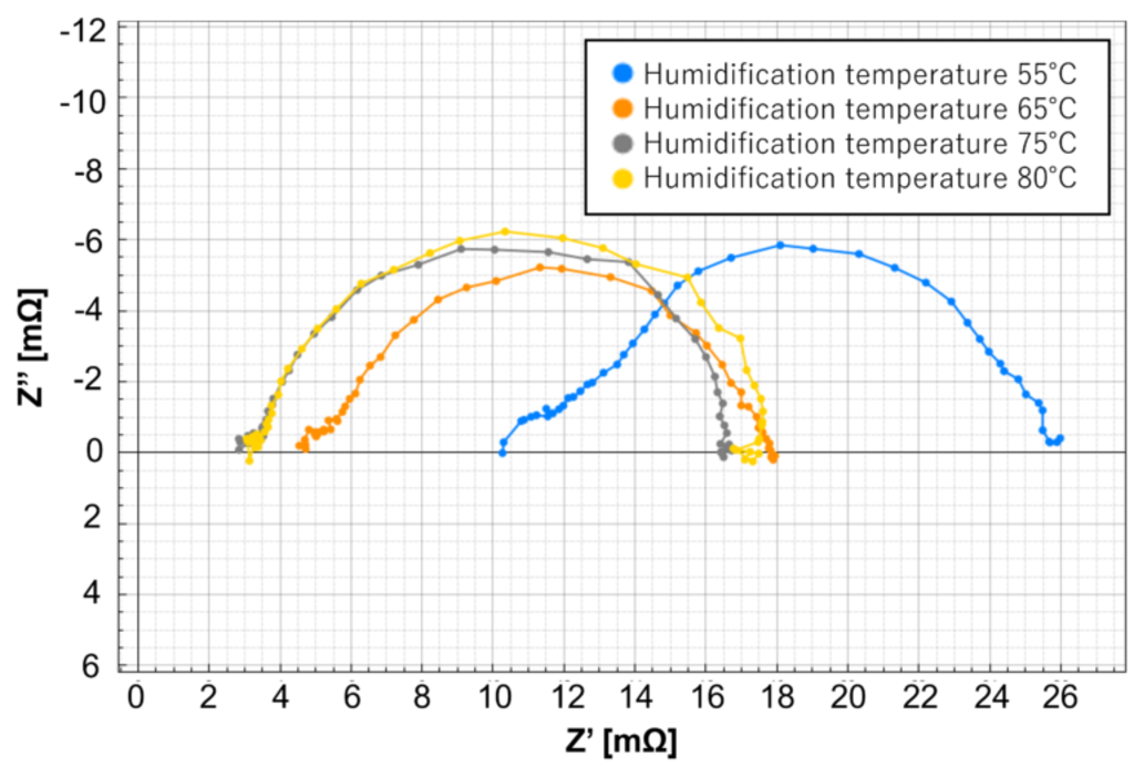 Comparing the Nyquist plot for each humidification temperature at 20% air utilization, we can see that the left end of the arc (high-frequency side impedance) increases at a humidification temperature of 55℃, resulting in a higher membrane resistance value. This is thought to indicate that the membrane is drying out due to inadequate humidification. When the humidification temperature exceeds 65℃, the relative humidity is approximately 55% or higher, and the membrane is moistened, resulting in a lower resistance value.