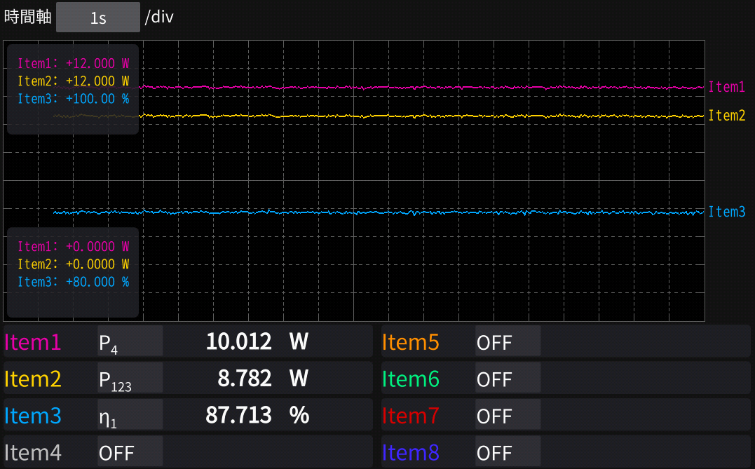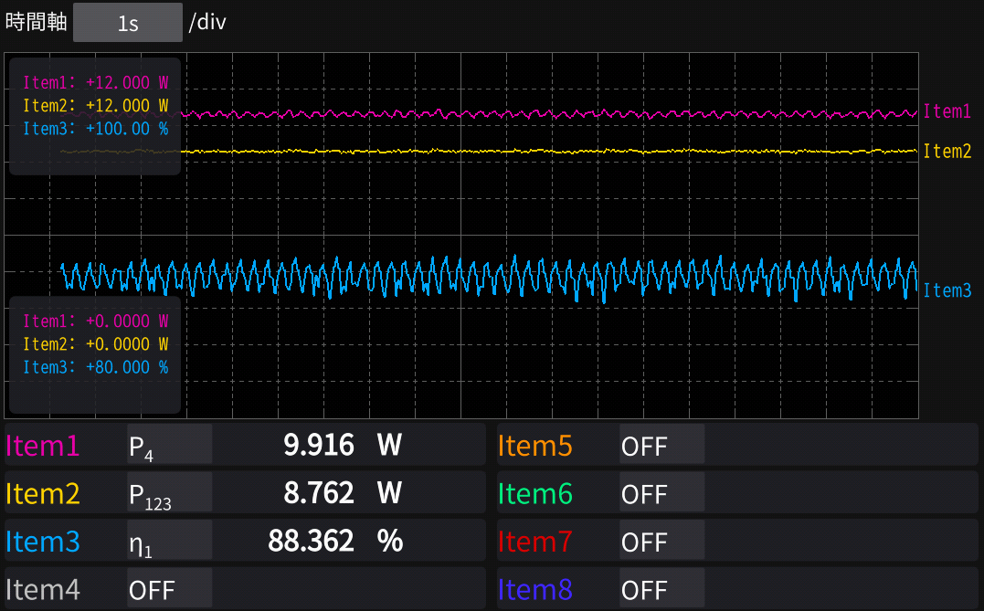 青い線の波形が効率の演算結果です。 (画像が切替わります)